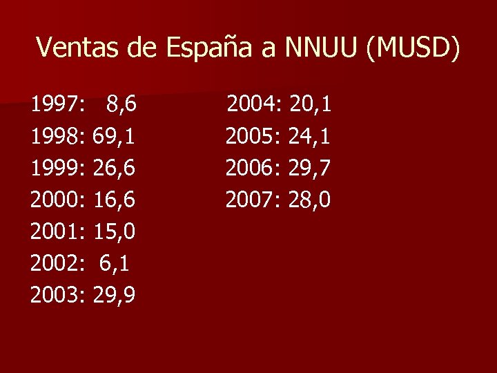 Ventas de España a NNUU (MUSD) 1997: 8, 6 1998: 69, 1 1999: 26, 6 2000: 16, 6 2001: 15, 0 2002: 6, 1 2003: 29, 9 2004: 20, 1 2005: 24, 1 2006: 29, 7 2007: 28, 0