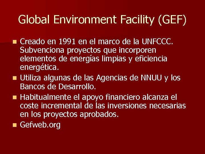 Global Environment Facility (GEF) Creado en 1991 en el marco de la UNFCCC. Subvenciona proyectos que incorporen elementos de energías limpias y eficiencia energética. n Utiliza algunas de las Agencias de NNUU y los Bancos de Desarrollo. n Habitualmente el apoyo financiero alcanza el coste incremental de las inversiones necesarias en los proyectos aprobados. n Gefweb. org n