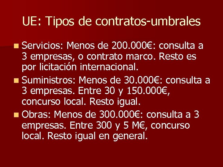 UE: Tipos de contratos-umbrales n Servicios: Menos de 200. 000€: consulta a 3 empresas, o contrato marco. Resto es por licitación internacional. n Suministros: Menos de 30. 000€: consulta a 3 empresas. Entre 30 y 150. 000€, concurso local. Resto igual. n Obras: Menos de 300. 000€: consulta a 3 empresas. Entre 300 y 5 M€, concurso local. Resto igual en general.