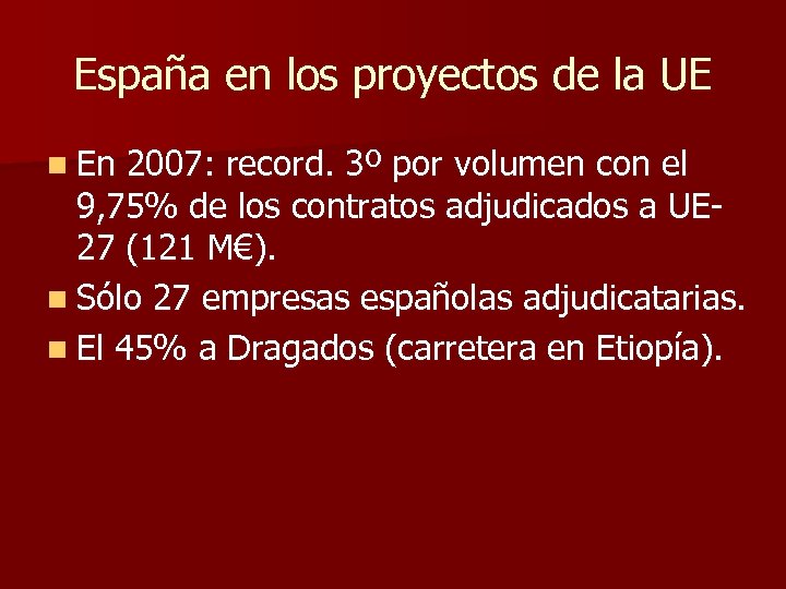 España en los proyectos de la UE n En 2007: record. 3º por volumen con el 9, 75% de los contratos adjudicados a UE 27 (121 M€). n Sólo 27 empresas españolas adjudicatarias. n El 45% a Dragados (carretera en Etiopía).