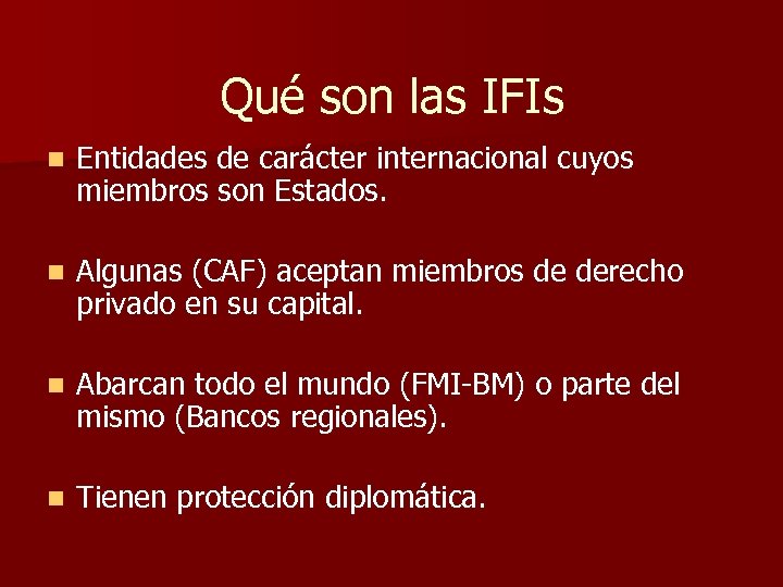 Qué son las IFIs n Entidades de carácter internacional cuyos miembros son Estados. n Algunas (CAF) aceptan miembros de derecho privado en su capital. n Abarcan todo el mundo (FMI-BM) o parte del mismo (Bancos regionales). n Tienen protección diplomática.