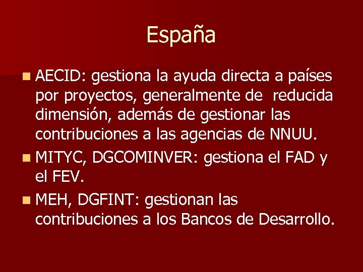 España n AECID: gestiona la ayuda directa a países por proyectos, generalmente de reducida dimensión, además de gestionar las contribuciones a las agencias de NNUU. n MITYC, DGCOMINVER: gestiona el FAD y el FEV. n MEH, DGFINT: gestionan las contribuciones a los Bancos de Desarrollo.