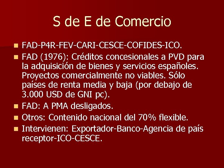 S de E de Comercio n n n FAD-P 4 R-FEV-CARI-CESCE-COFIDES-ICO. FAD (1976): Créditos concesionales a PVD para la adquisición de bienes y servicios españoles. Proyectos comercialmente no viables. Sólo países de renta media y baja (por debajo de 3. 000 USD de GNI pc). FAD: A PMA desligados. Otros: Contenido nacional del 70% flexible. Intervienen: Exportador-Banco-Agencia de país receptor-ICO-CESCE.