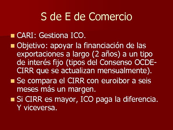 S de E de Comercio n CARI: Gestiona ICO. n Objetivo: apoyar la financiación de las exportaciones a largo (2 años) a un tipo de interés fijo (tipos del Consenso OCDECIRR que se actualizan mensualmente). n Se compara el CIRR con euroibor a seis meses más un margen. n Si CIRR es mayor, ICO paga la diferencia. Y viceversa.
