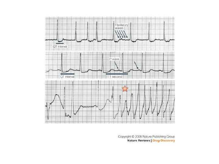 Аритмогенное действие противоаритмических средств (ПАС) Аритмогенному действию ПАС способствуют: • Изменения миокарда (ишемия, дилатация, гипертрофия, врожденное увеличение QT и др. ) • • Нарушения водно-электролитного (K, Mg) баланса и КОС Совместно принимаемые лекарства (дигиталис, диуретики) Формы нарушений: • Блокады (классы II, IY) • Триггерная активность во 2 -3 фазах ПД, т. е. ранняя следовая деполяризация, ведущая к полиморфной (пируэтной) желудочковой тахикардии (ПАС, увеличивающие QT, фенотиазины, ТЦАД, антигистаминные 1 поколения (дипразин) • Триггерная активность в 4 фазе ПД, т. е. поздняя следовая деполяризация (дигиталис, избыток кальция) • Холинолитическое действие с увеличением АВ-проведения и увеличением тахисистолии желудочков при фибрилляции предсердий с риском фибрилляции желудочков (класс IA)