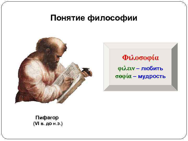 Понятие философии Φιλοσοφία φιλειν – любить σοφία – мудрость Пифагор (VI в. до н. э. )