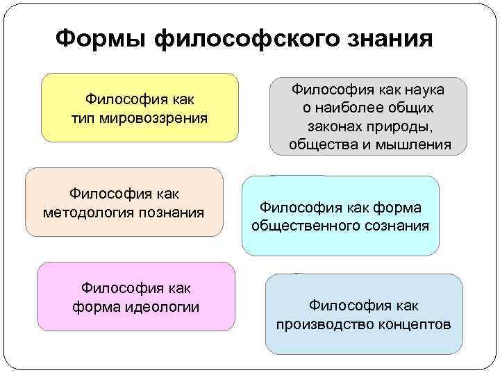 Формы философского знания Философия как наука Философия как о наиболее общих тип мировоззрения законах природы, общества и мышления Философия как методология познания Философия как форма общественного сознания Философия как форма идеологии Философия как производство концептов