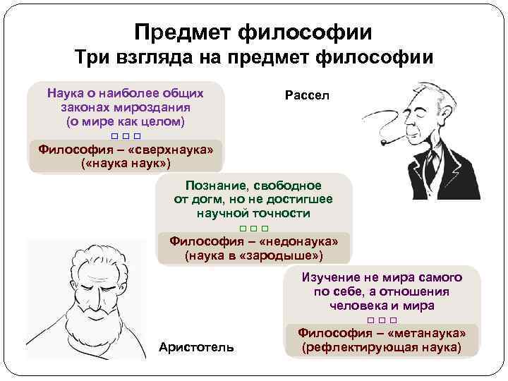 Предмет философии Три взгляда на предмет философии Наука о наиболее общих Рассел законах мироздания (о мире как целом) □ □ □ Философия – «сверхнаука» ( «наука наук» ) Познание, свободное от догм, но не достигшее научной точности □ □ □ Философия – «недонаука» (наука в «зародыше» ) Изучение не мира самого по себе, а отношения человека и мира □ □ □ Философия – «метанаука» Аристотель (рефлектирующее знание) (рефлектирующая наука)