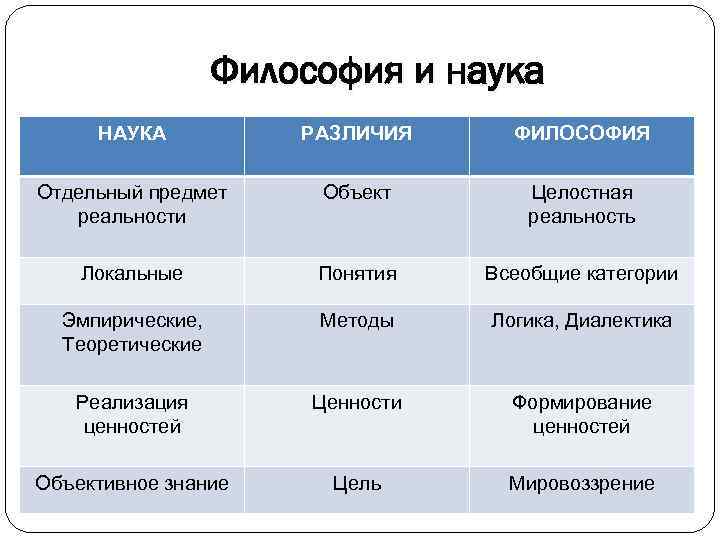 Философия и наука НАУКА РАЗЛИЧИЯ ФИЛОСОФИЯ Отдельный предмет Объект Целостная реальности реальность Локальные Понятия Всеобщие категории Эмпирические, Методы Логика, Диалектика Теоретические Реализация Ценности Формирование ценностей ценностей Объективное знание Цель Мировоззрение