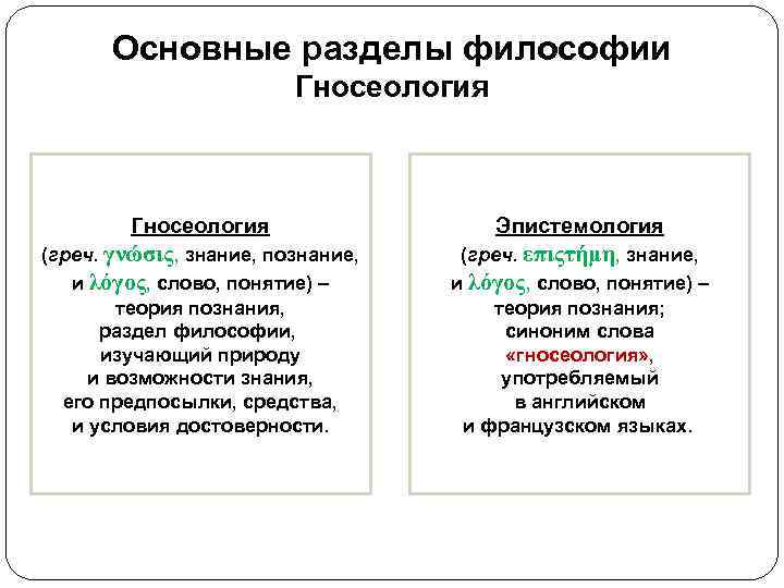 Основные разделы философии Гносеология Эпистемология (греч. γνώσις, знание, познание, (греч. επιςτήμη, знание, и λόγος, слово, понятие) – теория познания, теория познания; раздел философии, синоним слова изучающий природу «гносеология» , и возможности знания, употребляемый его предпосылки, средства, в английском и условия достоверности. и французском языках.