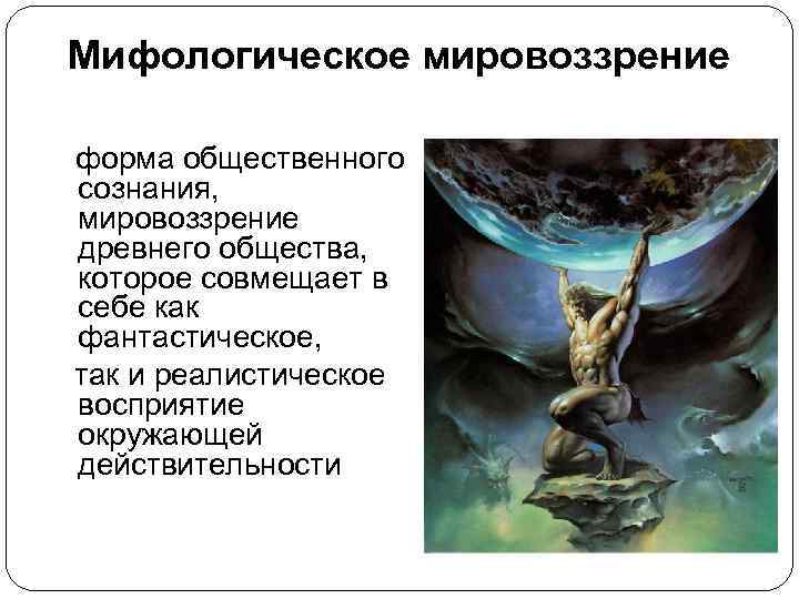 Мифологическое мировоззрение форма общественного сознания, мировоззрение древнего общества, которое совмещает в себе как фантастическое, так и реалистическое восприятие окружающей действительности
