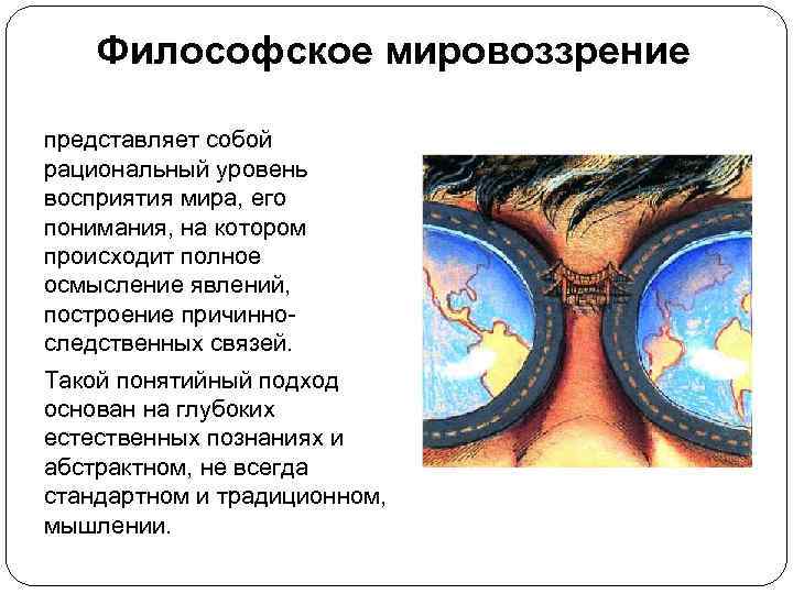 Философское мировоззрение представляет собой рациональный уровень восприятия мира, его понимания, на котором происходит полное осмысление явлений, построение причинно- следственных связей. Такой понятийный подход основан на глубоких естественных познаниях и абстрактном, не всегда стандартном и традиционном, мышлении.