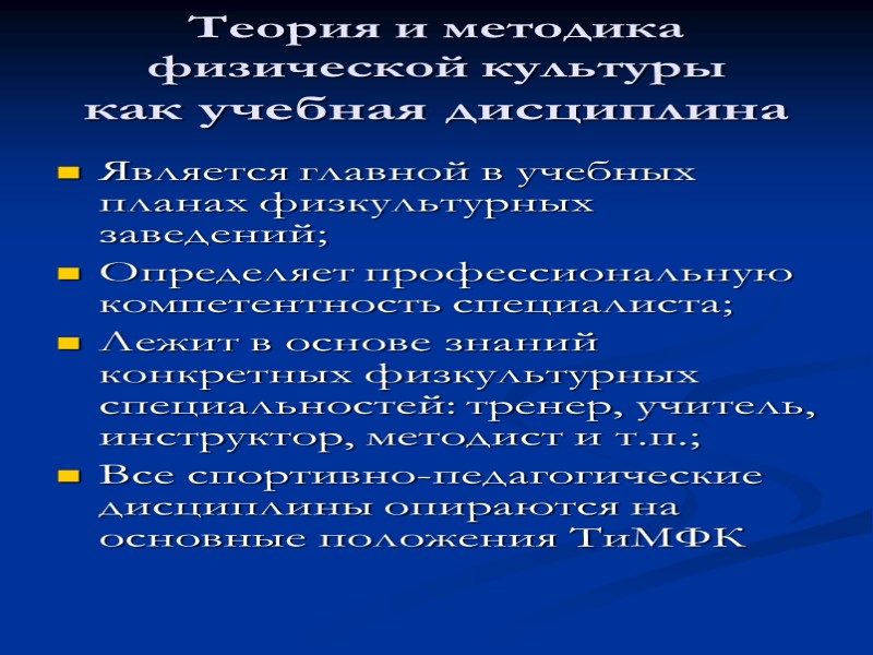 Теория и методика физической культуры как учебная дисциплина Является главной в учебных планах физкультурных заведений; Определяет профессиональную компетентность специалиста; Лежит в основе знаний конкретных физкультурных специальностей: тренер, учитель, инструктор, методист и т.п.; Все спортивно-педагогические дисциплины опираются на основные положения ТиМФК