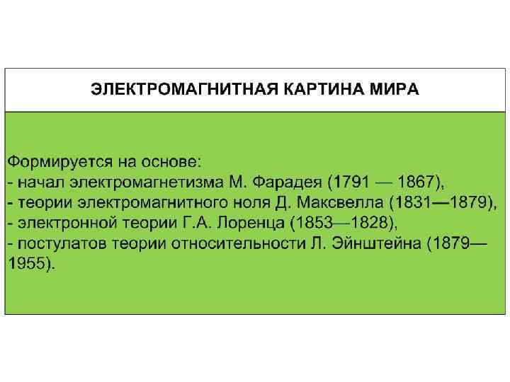 Характерные особенности электромагнитной картины мира (продолжение) • Игнорирование дискретной, атомистической природы вещества приводит максвелловскую электродинамику к целому ряду противоречий, которые снимаются с созданием Г. Лоренцом электронной теории или микроскопической электродинамики. Последняя восстанавливает в своих правах дискретные электрические заряды, но она сохраняет и поле как объективную реальность. • Реляционная (относительная) концепция пространства и времени: а пространство и время связаны с процессами, происходящими в поле, т. е. они несамостоятельны и зависимы от материи. • А. Эйнштейн ввел в электромагнитную картину мира идею относительности пространства и времени. Так появилась общая теория относительности, ставшая последней крупной теорией, созданной (1916) в рамках электромагнитной картины мира.