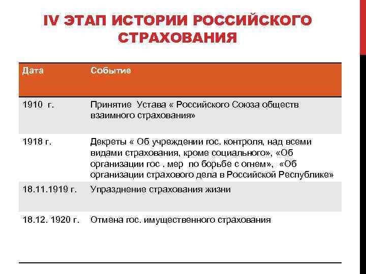 IV ЭТАП ИСТОРИИ РОССИЙСКОГО СТРАХОВАНИЯ Дата Событие 1910 г. Принятие Устава « Российского Союза обществ взаимного страхования» 1918 г. Декреты « Об учреждении гос. контроля, над всеми видами страхования, кроме социального» , «Об организации гос. мер по борьбе с огнем» , «Об организации страхового дела в Российской Республике» 18. 11. 1919 г. Упразднение страхования жизни 18. 12. 1920 г. Отмена гос. имущественного страхования