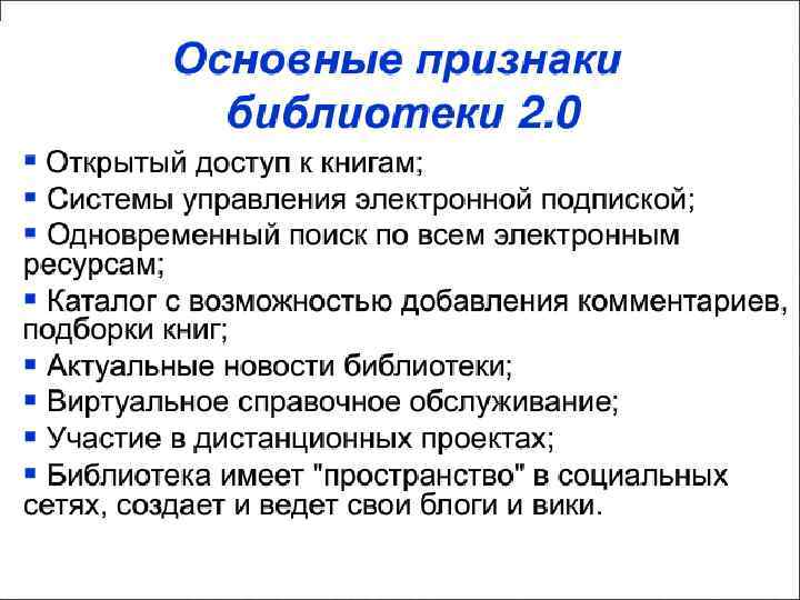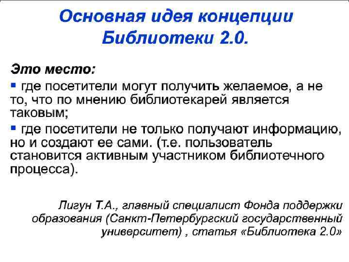 Library 2. 0 - это колоссальный прорыв! Раньше бытовало устойчивое мнение, что сначала контент надо отфильтровать, а потом публиковать. Теперь схема перевернулась: контент сначала публикуют, потому что это очень дёшево, а потом подвергают экспертизе, сертифицируют в соответствии со всеми ступенями вертикали вкуса - каждому легко найти в этом случае что-то своё. Для библиотекарей возникают новые возможности и перспективы - стать центром сертификации/рекомендации контента: и самим сертифицировать/рекомендовать, и организовывать такую работу с волонтёрами и пользователями. Собственно, именно это направление (управление чтением) изначально характерно для российских библиотек (особенно их советских предшественников). Это позволяет ставить задачу по прорывному переходу российских библиотек сразу к уровню Библиотеки 3. 0, минуя Библиотеку 2. 0… http: //www. nlr. ru/prof/publ/bibliograf/2011/bd 06. pdf