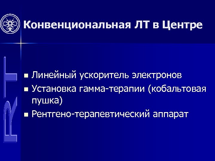 Конвенциональная ЛТ в Центре Линейный ускоритель электронов n Установка гамма-терапии (кобальтовая пушка) n Рентгено-терапевтический аппарат n