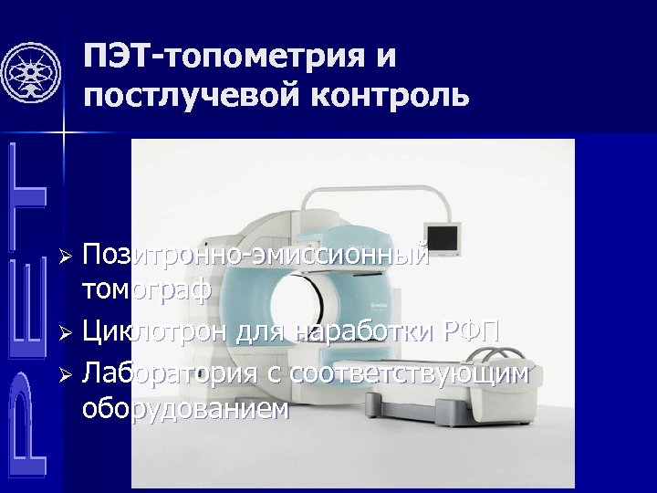ПЭТ-топометрия и постлучевой контроль Позитронно-эмиссионный томограф Ø Циклотрон для наработки РФП Ø Лаборатория с соответствующим оборудованием Ø