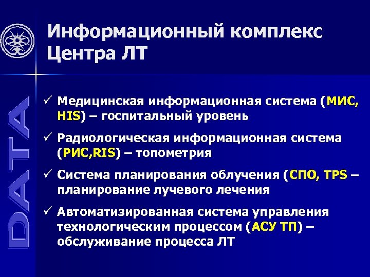 Информационный комплекс Центра ЛТ ü Медицинская информационная система (МИС, HIS) – госпитальный уровень ü Радиологическая информационная система (РИС, RIS) – топометрия ü Система планирования облучения (СПО, TPS – планирование лучевого лечения ü Автоматизированная система управления технологическим процессом (АСУ ТП) – обслуживание процесса ЛТ