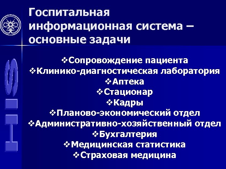 Госпитальная информационная система – основные задачи v. Сопровождение пациента v. Клинико-диагностическая лаборатория v. Аптека v. Стационар v. Кадры v. Планово-экономический отдел v. Административно-хозяйственный отдел v. Бухгалтерия v. Медицинская статистика v. Страховая медицина