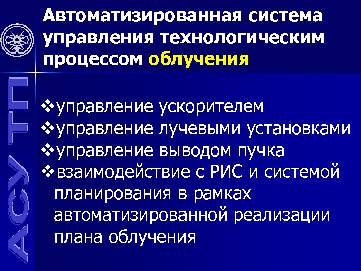 Автоматизированная система управления технологическим процессом облучения vуправление ускорителем vуправление лучевыми установками vуправление выводом пучка vвзаимодействие с РИС и системой планирования в рамках автоматизированной реализации плана облучения