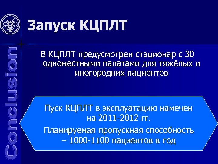 Запуск КЦПЛТ В КЦПЛТ предусмотрен стационар с 30 одноместными палатами для тяжёлых и иногородних пациентов Пуск КЦПЛТ в эксплуатацию намечен на 2011 -2012 гг. Планируемая пропускная способность – 1000 -1100 пациентов в год