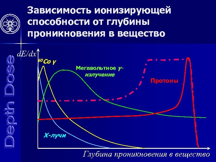 Зависимость ионизирующей способности от глубины проникновения в вещество d. E/dx 60 Co γ Мегавольтное γ- излучение Протоны X-лучи Глубина проникновения в вещество
