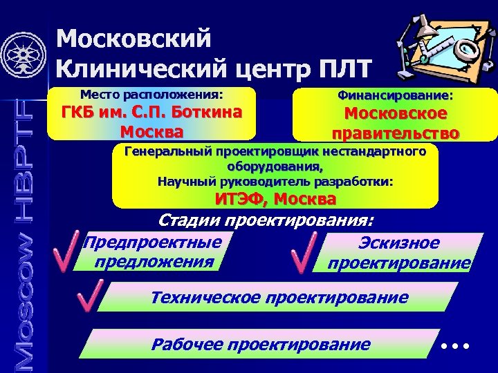 Московский Клинический центр ПЛТ Место расположения: ГКБ им. С. П. Боткина Москва Финансирование: Московское правительство Генеральный проектировщик нестандартного оборудования, Научный руководитель разработки: ИТЭФ, Москва Стадии проектирования: Предпроектные Эскизное предложения проектирование Техническое проектирование Рабочее проектирование …