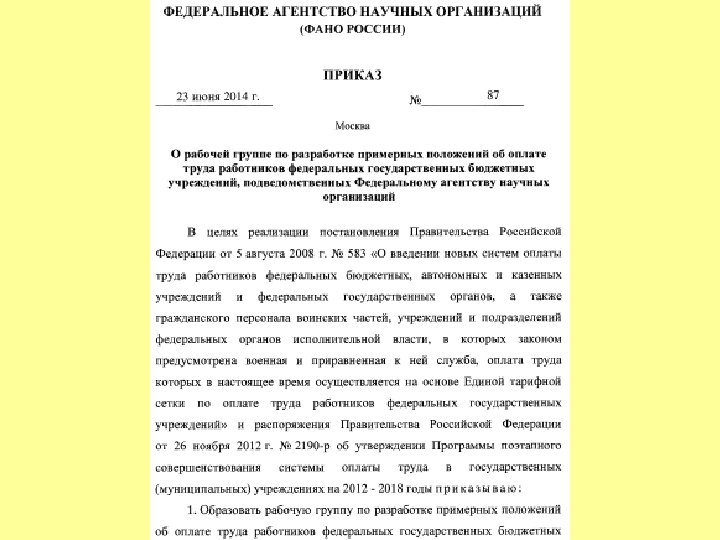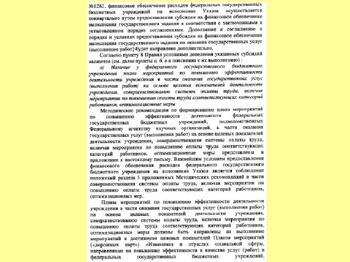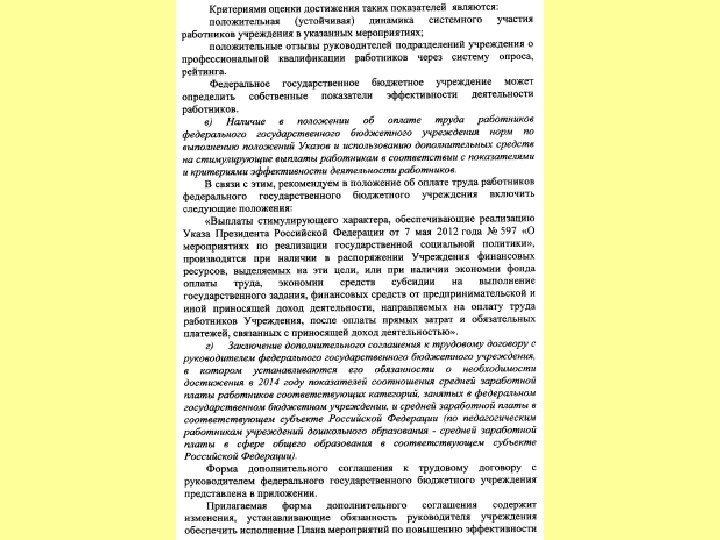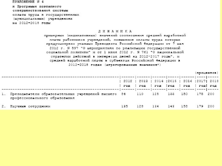 УКАЗ ПРЕЗИДЕНТА РОССИЙСКОЙ ФЕДЕРАЦИИ О мероприятиях по реализации государственной социальной политики В целях дальнейшего совершенствования государственной социальной политики постановляю: 1. Правительству Российской Федерации: а) обеспечить: увеличение к 2018 году размера реальной заработной платы в 1, 4 - 1, 5 раза; … повышение к 2018 году средней заработной платы врачей, преподавателей образовательных учреждений высшего профессионального образования и научных сотрудников до 200 процентов от средней заработной платы в соответствующем регионе. увеличение к 2020 году числа высококвалифицированных работников, с тем чтобы оно составляло не менее трети от числа квалифицированных работников; … установление базовых окладов по профессиональным квалификационным группам; повышение заработной платы работников бюджетного сектора экономики с возможным привлечением на эти цели не менее трети средств, получаемых за счет реорганизации неэффективных организаций; ж) создать прозрачный механизм оплаты труда руководителей организаций, финансируемых за счет бюджетных ассигнований федерального бюджета, установив соотношение средней заработной платы руководителей и работников этих организаций и предусмотрев представление руководителями этих организаций сведений о доходах, об имуществе и обязательствах имущественного характера; … • Правительству Российской Федерации, органам исполнительной власти субъектов Российской Федерации предусмотреть при формировании соответственно федерального бюджета и бюджетов субъектов Российской Федерации на 2013 год и на плановый период 2014 и 2015 годов бюджетные ассигнования на реализацию мер, предусмотренных настоящим Указом.