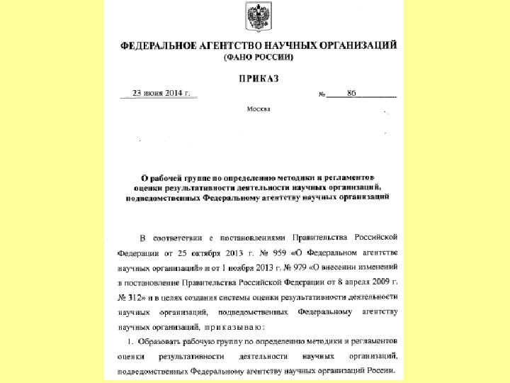 О рабочей группе по определению методики и регламентов оценки результативности деятельности научных организаций