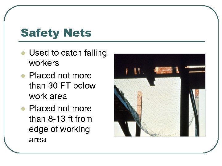 Safety Nets l l l Used to catch falling workers Placed not more than 30 FT below work area Placed not more than 8 -13 ft from edge of working area