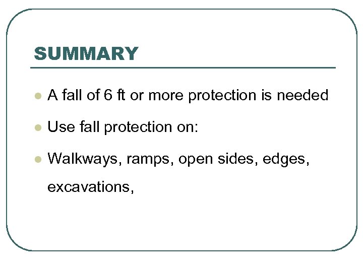 SUMMARY l A fall of 6 ft or more protection is needed l Use fall protection on: l Walkways, ramps, open sides, edges, excavations,