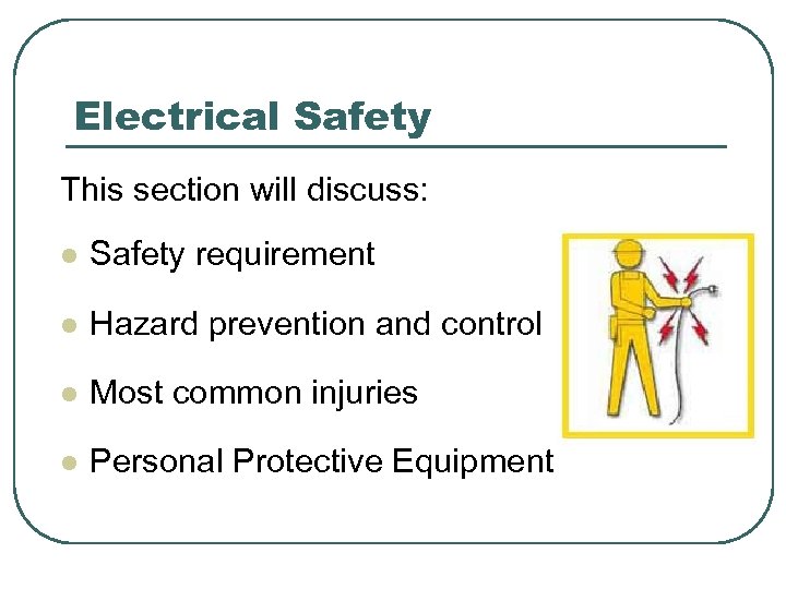 Electrical Safety This section will discuss: l Safety requirement l Hazard prevention and control l Most common injuries l Personal Protective Equipment