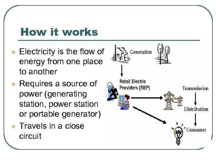 How it works l l l Electricity is the flow of energy from one place to another Requires a source of power (generating station, power station or portable generator) Travels in a close circuit