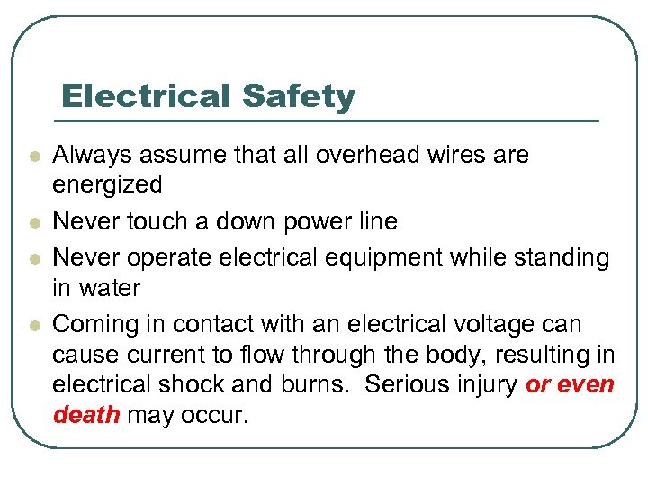 Electrical Safety l l Always assume that all overhead wires are energized Never touch a down power line Never operate electrical equipment while standing in water Coming in contact with an electrical voltage can cause current to flow through the body, resulting in electrical shock and burns. Serious injury or even death may occur.