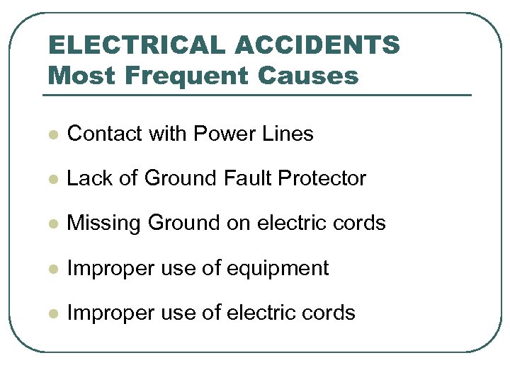 ELECTRICAL ACCIDENTS Most Frequent Causes l Contact with Power Lines l Lack of Ground Fault Protector l Missing Ground on electric cords l Improper use of equipment l Improper use of electric cords
