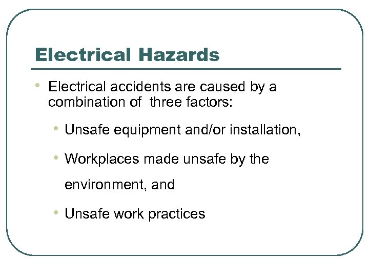 Electrical Hazards • Electrical accidents are caused by a combination of three factors: • Unsafe equipment and/or installation, • Workplaces made unsafe by the environment, and • Unsafe work practices