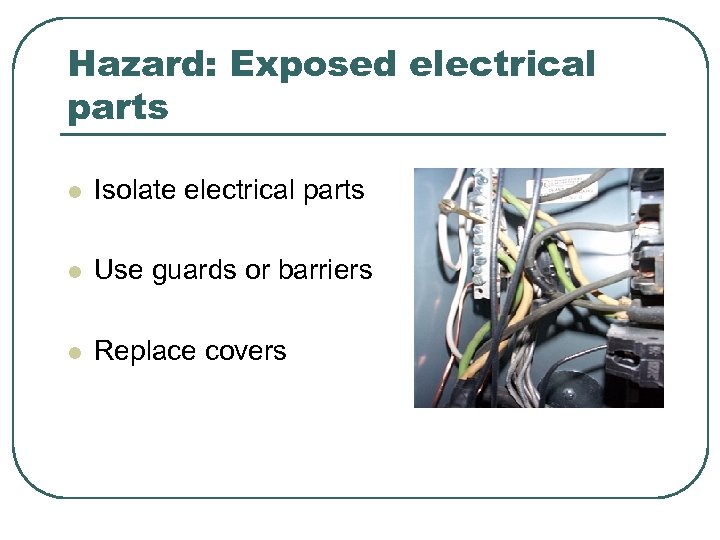 Hazard: Exposed electrical parts l Isolate electrical parts l Use guards or barriers l Replace covers