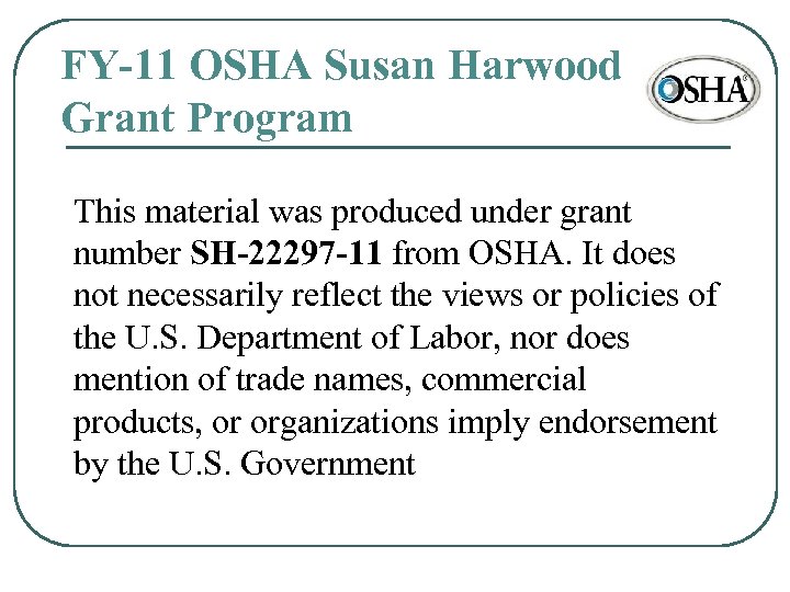 FY-11 OSHA Susan Harwood Grant Program This material was produced under grant number SH-22297 -11 from OSHA. It does not necessarily reflect the views or policies of the U. S. Department of Labor, nor does mention of trade names, commercial products, or organizations imply endorsement by the U. S. Government