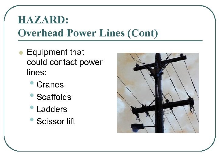 HAZARD: Overhead Power Lines (Cont) l Equipment that could contact power lines: • Cranes • Scaffolds • Ladders • Scissor lift