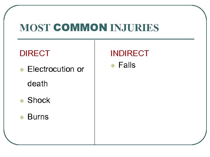 MOST COMMON INJURIES DIRECT l Electrocution or death l Shock l Burns INDIRECT l Falls
