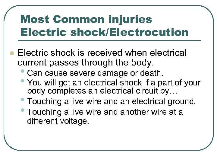 Most Common injuries Electric shock/Electrocution l Electric shock is received when electrical current passes through the body. • Can cause severe damage or death. • You will get an electrical shock if a part of your body completes an electrical circuit by… • Touching a live wire and an electrical ground, • Touching a live wire and another wire at a different voltage.