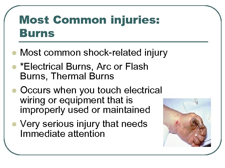 Most Common injuries: Burns l l Most common shock-related injury *Electrical Burns, Arc or Flash Burns, Thermal Burns Occurs when you touch electrical wiring or equipment that is improperly used or maintained Very serious injury that needs Immediate attention
