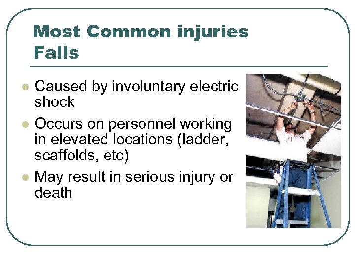 Most Common injuries Falls l l l Caused by involuntary electric shock Occurs on personnel working in elevated locations (ladder, scaffolds, etc) May result in serious injury or death