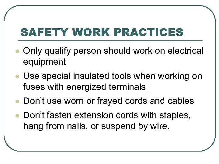 SAFETY WORK PRACTICES l Only qualify person should work on electrical equipment l Use special insulated tools when working on fuses with energized terminals l Don’t use worn or frayed cords and cables l Don’t fasten extension cords with staples, hang from nails, or suspend by wire.