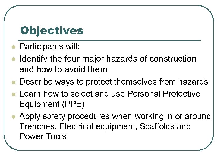 Objectives l l l Participants will: Identify the four major hazards of construction and how to avoid them Describe ways to protect themselves from hazards Learn how to select and use Personal Protective Equipment (PPE) Apply safety procedures when working in or around Trenches, Electrical equipment, Scaffolds and Power Tools
