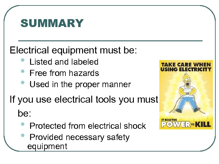 SUMMARY Electrical equipment must be: • • • Listed and labeled Free from hazards Used in the proper manner If you use electrical tools you must be: • • Protected from electrical shock Provided necessary safety equipment