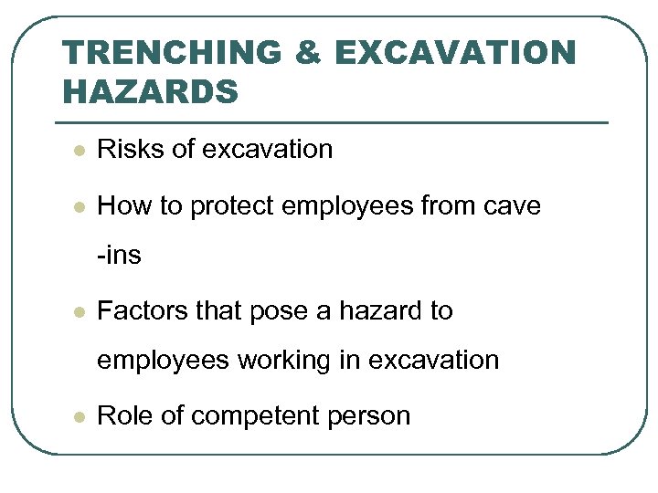 TRENCHING & EXCAVATION HAZARDS l Risks of excavation l How to protect employees from cave -ins l Factors that pose a hazard to employees working in excavation l Role of competent person