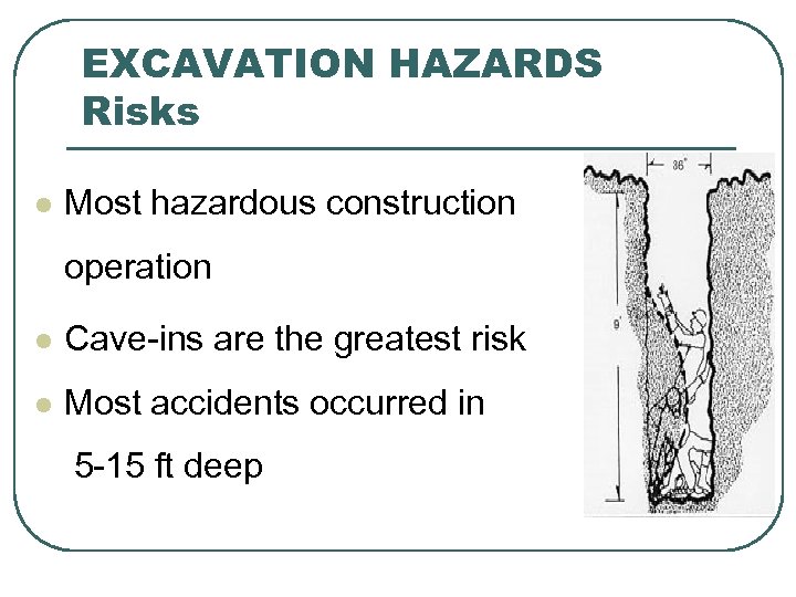 EXCAVATION HAZARDS Risks l Most hazardous construction operation l Cave-ins are the greatest risk l Most accidents occurred in 5 -15 ft deep