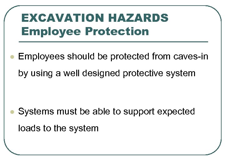 EXCAVATION HAZARDS Employee Protection l Employees should be protected from caves-in by using a well designed protective system l Systems must be able to support expected loads to the system